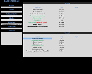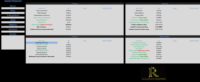Seja qual for o seu objetivo, a planilha de treino será pautada em cima das suas necessidades, levando em consideração a sua atual condição física, nível de treinamento, dentre outros aspectos relevantes sempre com o intuito de otimizar o seu resultado.
